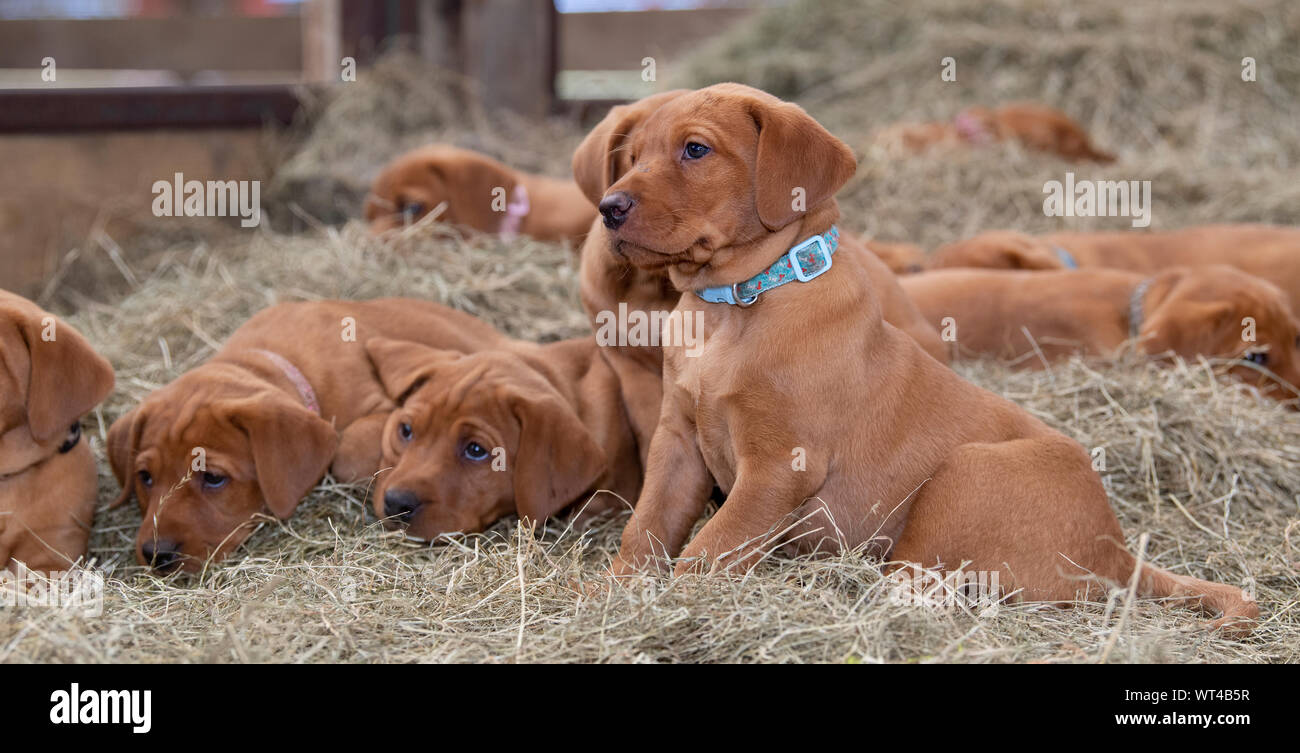 Fox Red Labrador Pups Around 8 Weeks Old In Farm Shed Cumbria Uk Stock Photo Alamy
